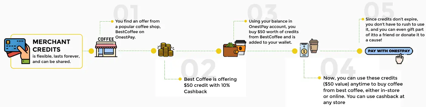 Customers purchase credits from merchants (within OnestPay™ platform), often at a discount, to use for future purchases, giving customers instant savings. Merchants typically accept these credits as payment for goods or services.