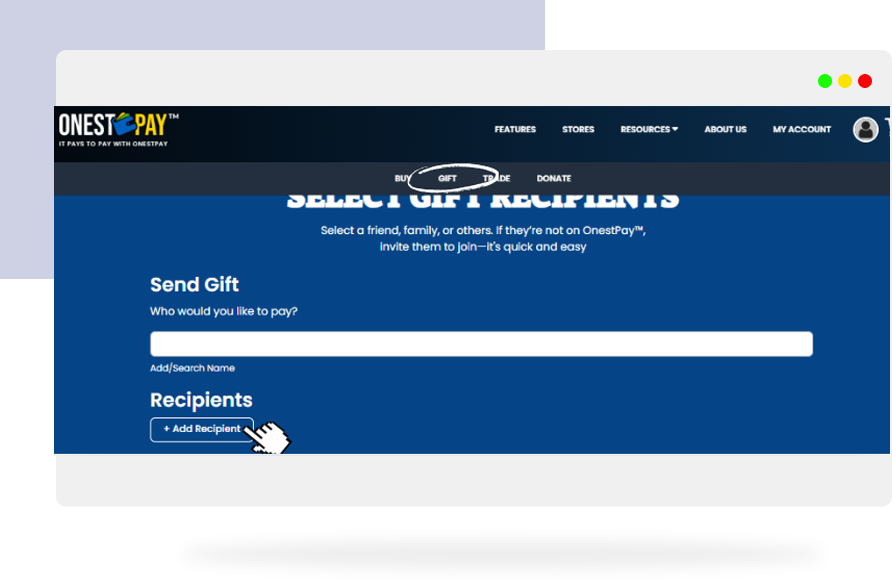 Visit onestpay.com. Navigate to the Gift section, and click on ‘Add Recipient’ to get started.