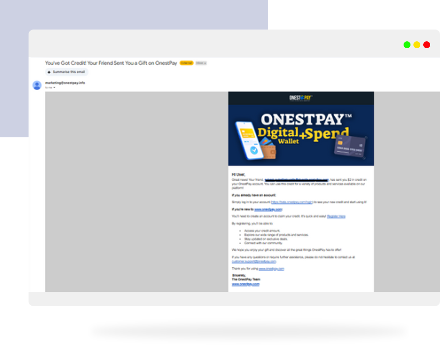 With OnestPay™, you don’t have to wait. Our gifting feature lets you send Merchant Credits to anyone — even if they haven’t created an account yet.