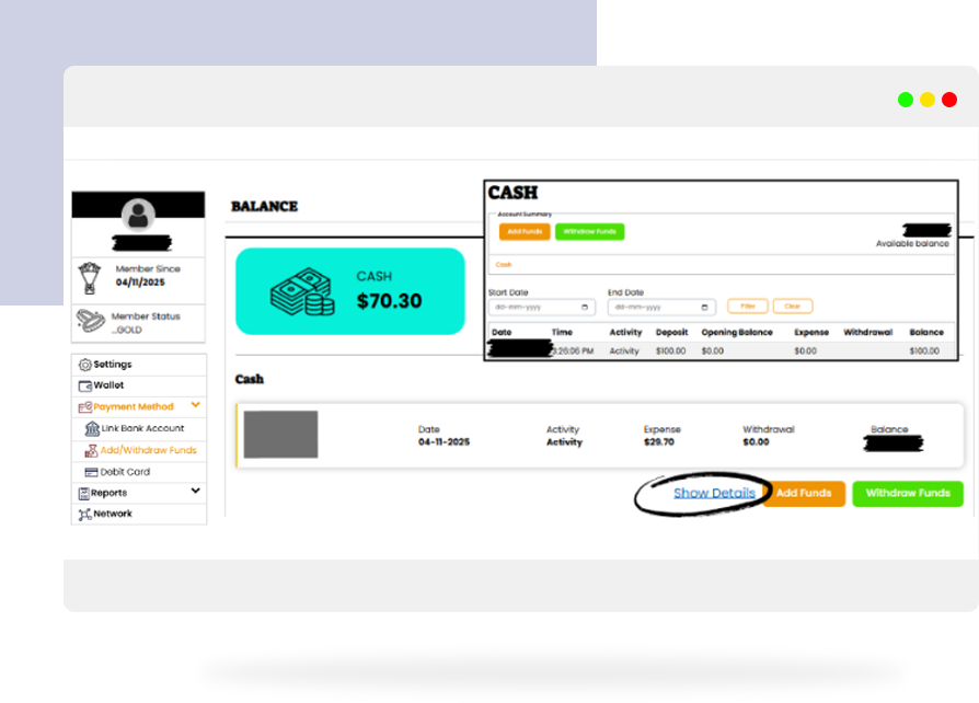 A table showing Date, Activity, Expense, Withdrawal, and Balance